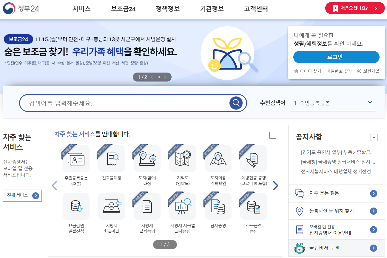 그리고 만약에 정부24시 홈페이지를 자주 이용하시려면 회원가입을 해놓는 것이 좋습니다.