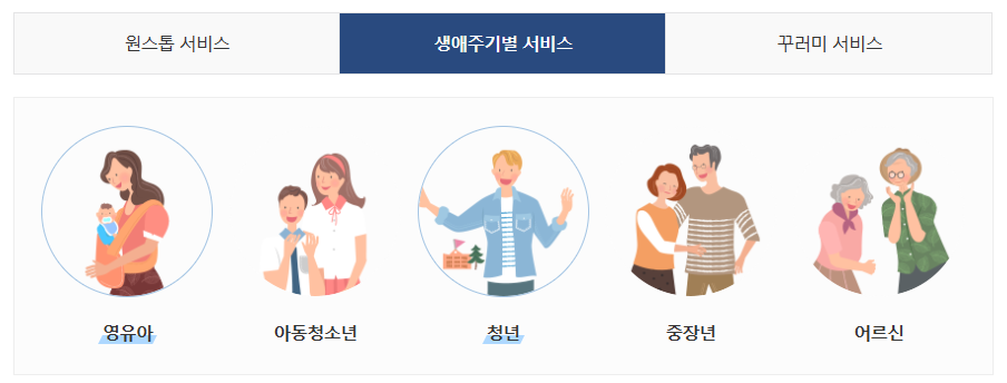 청년을 클릭하면 이렇게 청년과 관련된 여러가지 서비스를 확인할 수가 있을 것입니다.