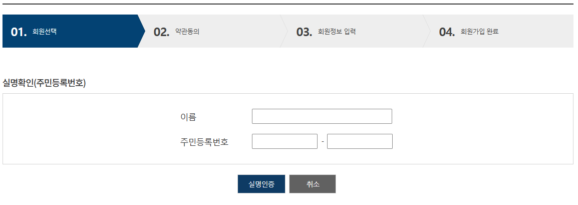 개인 내국인 기준으로 이름, 주민등록번호를 입력하여 실명인증을 하여야 하며 실명인증 후 회원정보를 입력하시면 간편하게 회원가입을 할 수가 있습니다.