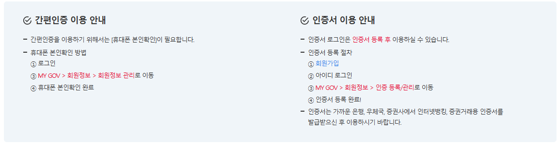 등록 방법은 MY GOV -> 회원 정보 -> 회원 정보 관리이며, 인증서 등록 방법은 MY GOV -> 회원정보 -> 인증 등록/관리입니다.