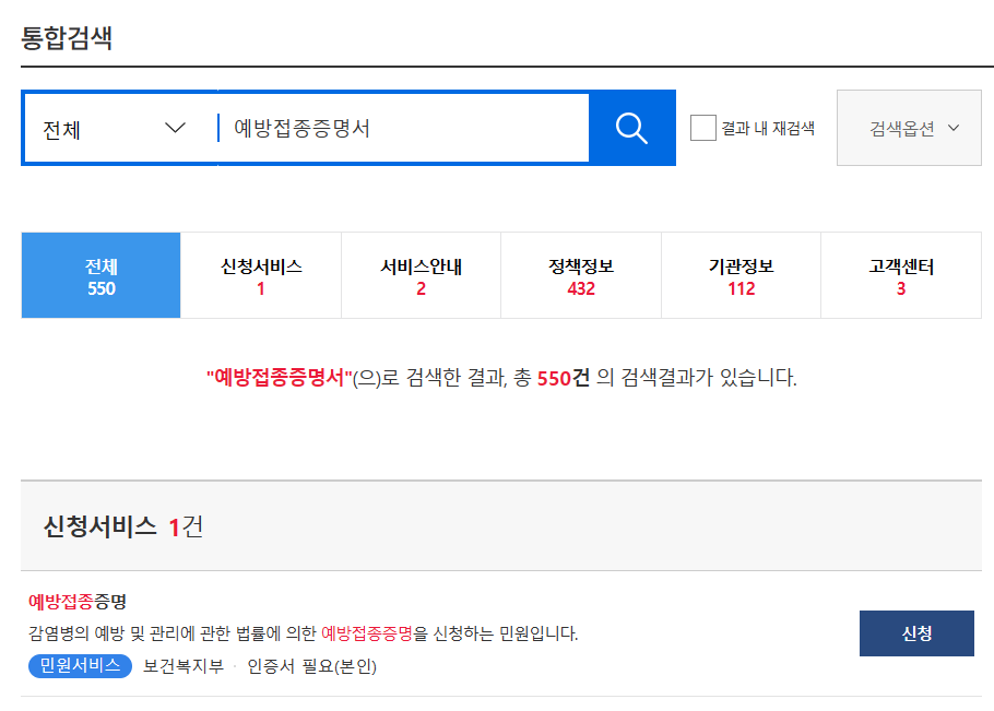 신청 서비스 1건이라고 결과가 나와있고 예방접증증명서는 감염병 예방 및 관리에 관한 법률에 의해서 증명을 신청하는 것이라고 되어 있습니다.