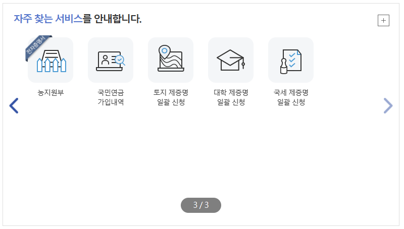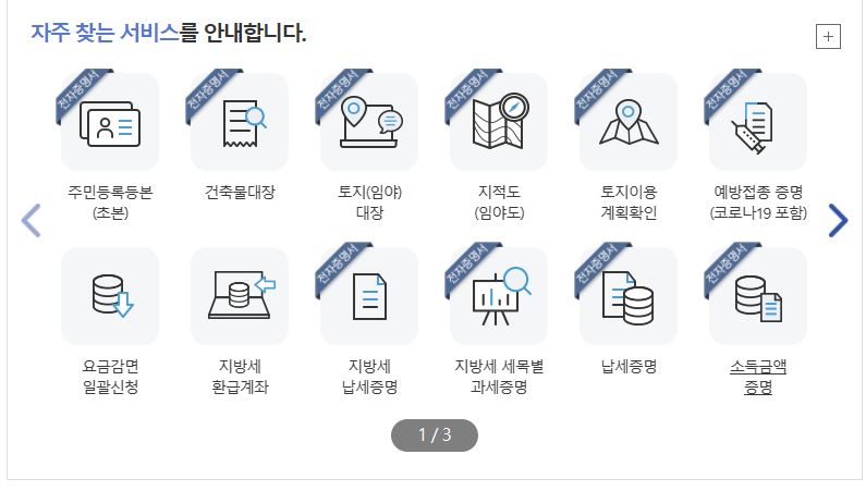 다시 정부24시 홈페이지 메인화면으로 돌아와서 아래쪽을 보시면 자주 찾는 서비스가 보일 것입니다.