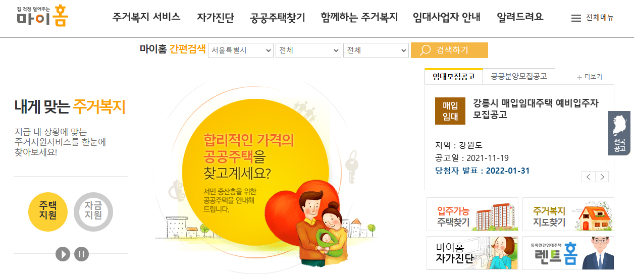 마이홈포털 홈페이지에서는 주거와 관련된 여러가지 정보들을 확인하실 수가 있습니다. 많이들 알고계시는 임대주택부터 공공분양까지 다양한 주거복지와 관련된 혜택들을 확인하실 수가 있는데 하나하나 보도록 하겠습니다.