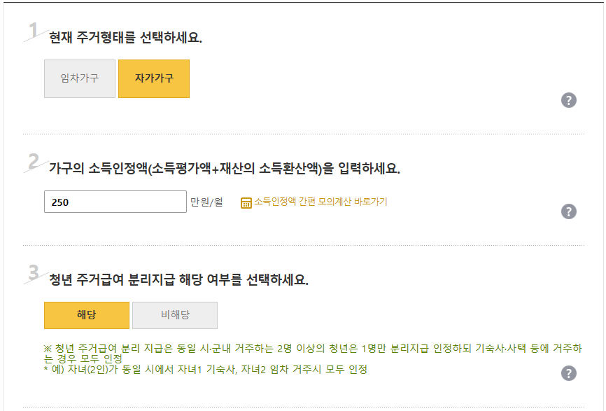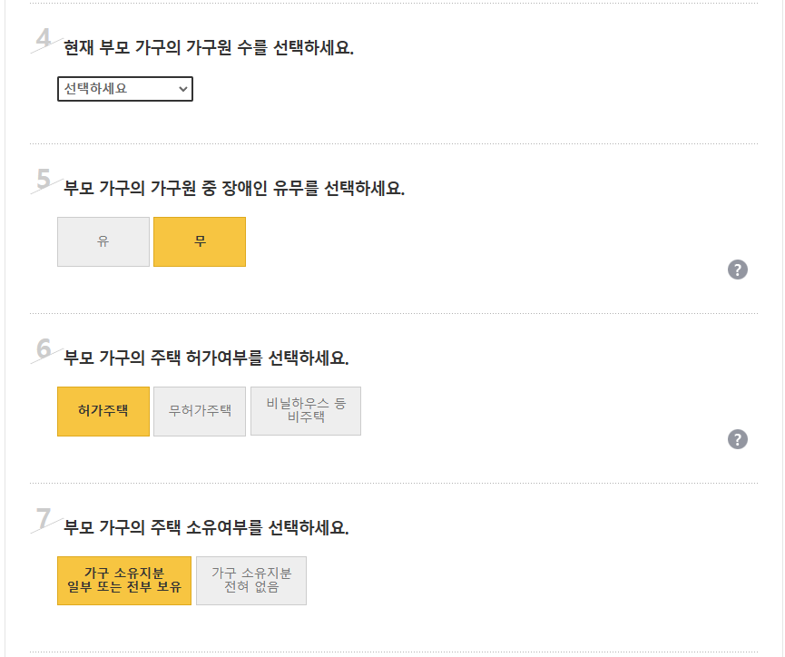 현재 부모 가구의 가구원 수, 부모 가구의 가구원 중 장애인 유무, 부모 가구의 주택 허가 여부, 부모 가구의 주택 소유여부를 선택하여야합니다. 선택을 하고나면 다시 선택해야하는 몇가지 사항이 나올 것입니다.
