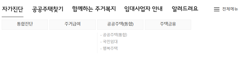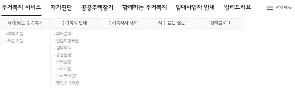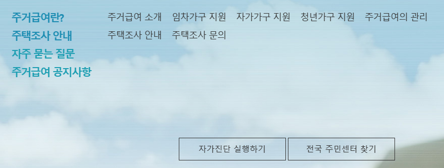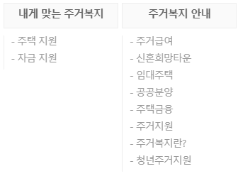 주거복지에는 주거급여, 임대주택, 공공 분양, 주거지원 등이 보이는데 아무거나 클릭을 하면 혜택, 자격 등 자세한 내용을 보실 수가 있습니다.