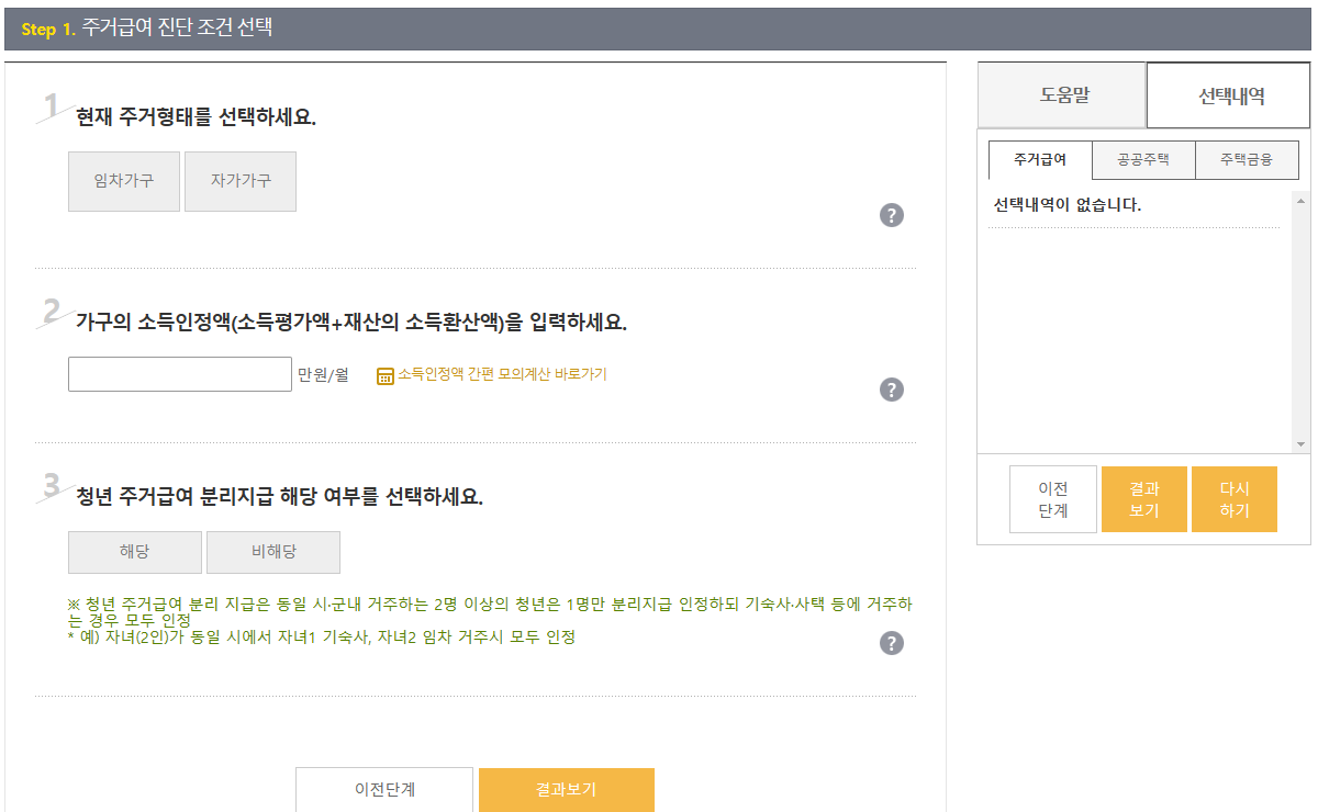 자가진단을 하려면 현재 주거 형태, 가구의 소득인정액, 청년 주거급여 분리지급 여부 등 여러가지를 선택하여야 합니다.