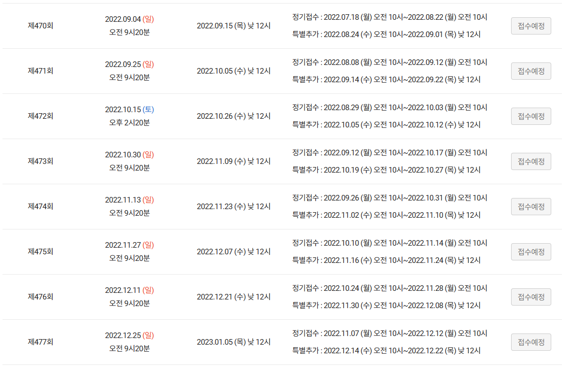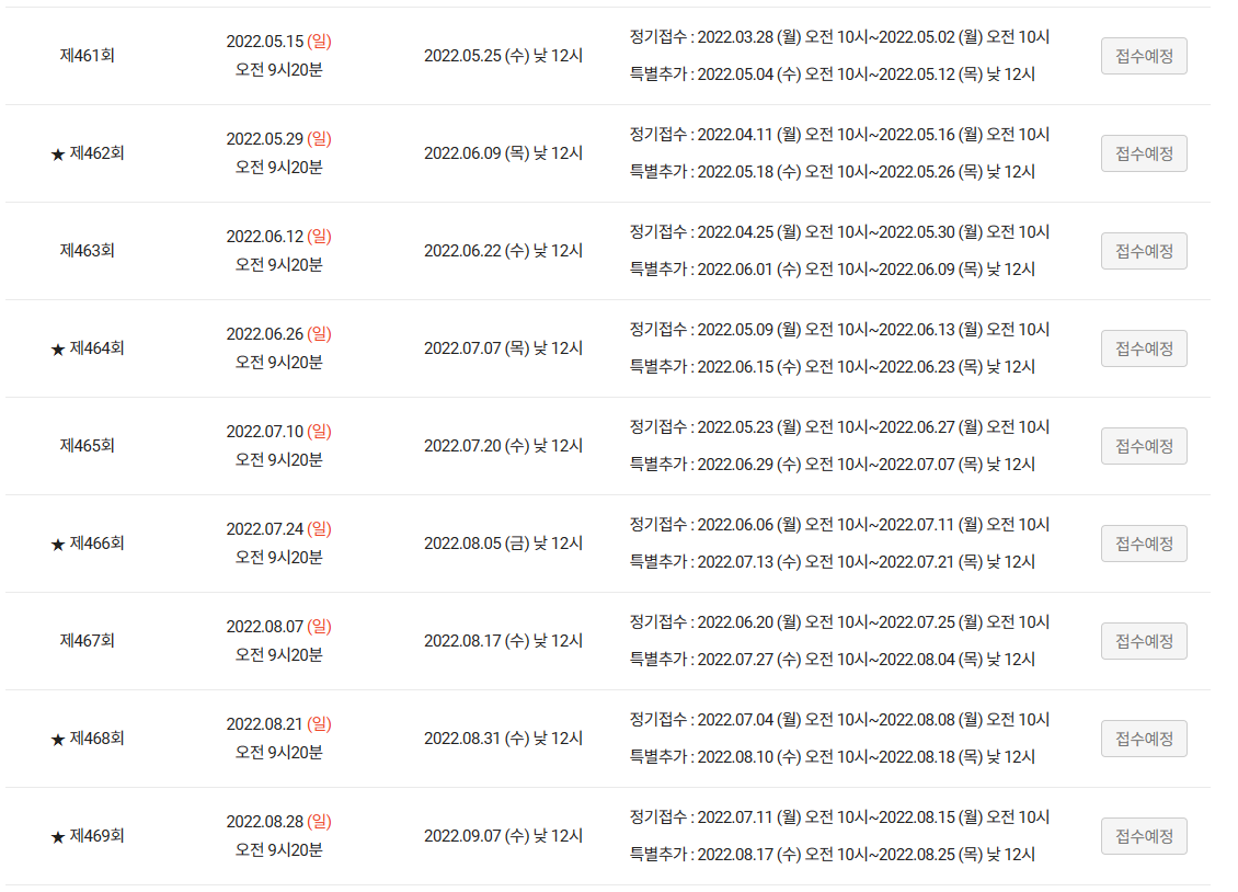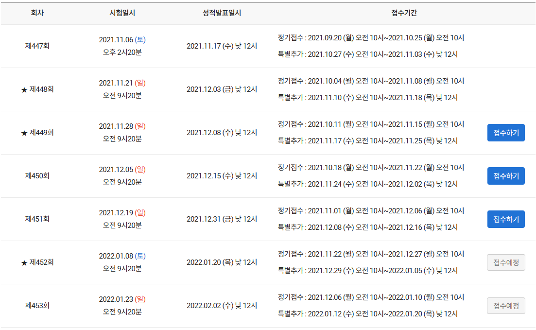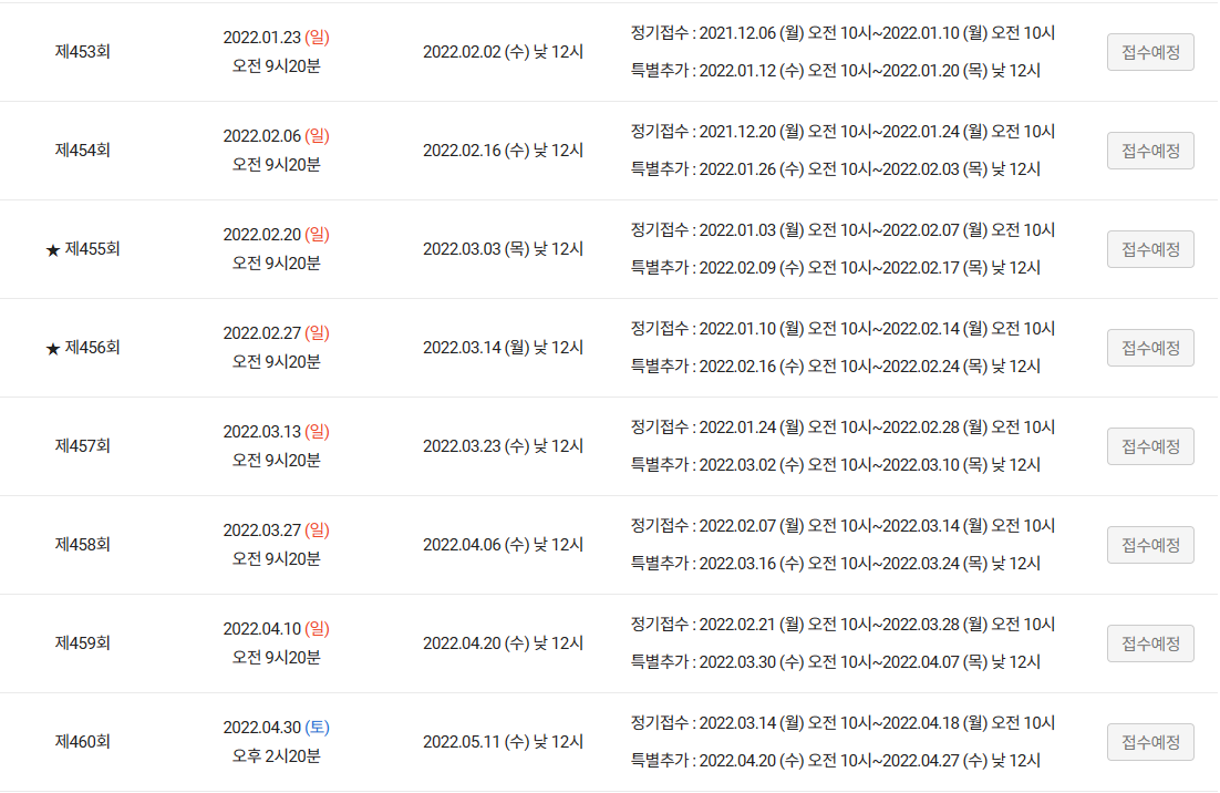 제 453회는 접수기간이 2021년 12월 6일 부터 오전 10시부터 2022년 1월 10일 오전 10시까지, 제 454회는 2021년 12월 20일 10시부터 2022년 1월 24일 오전 10시까지, 제 455회는 접수기간이 2022년 1월 3일 오전 10시부터 2월 7일 오전 10시까지입니다.