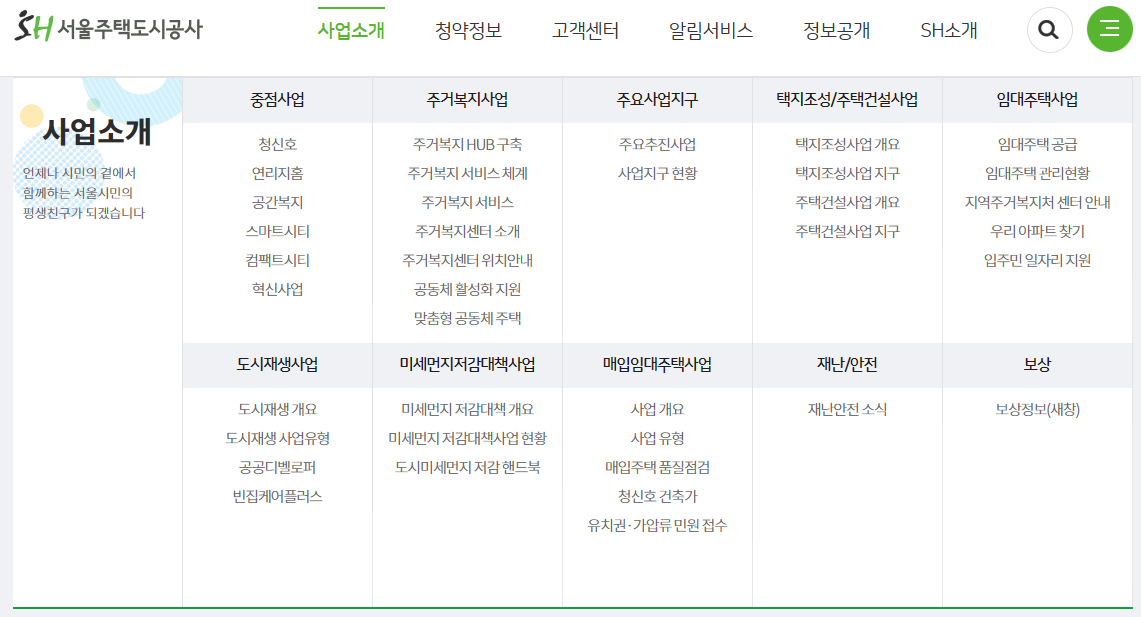 사업소개를 클릭하니 sh에서 현재 하고 있는 여러가지 사업들이 보입니다.