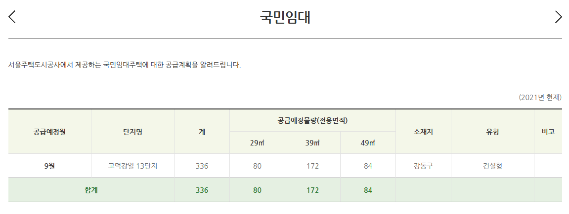 공급계획을 클릭하니 국민임대, 행복주택, 역세권 청년주택 등이 보입니다.