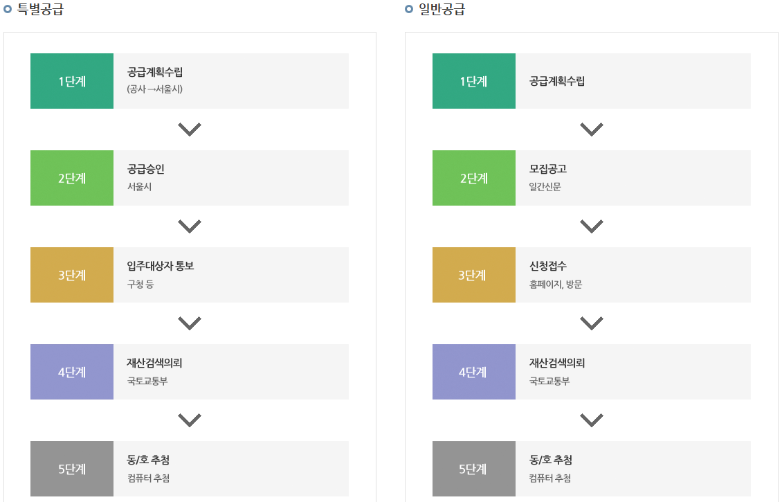 특별공급 기준으로 1단계는 공급계획수립, 2단계는 공급승인, 3단계는 입주대상자 통보, 4단계는 재산검색의뢰, 5단계 동/호 추첨