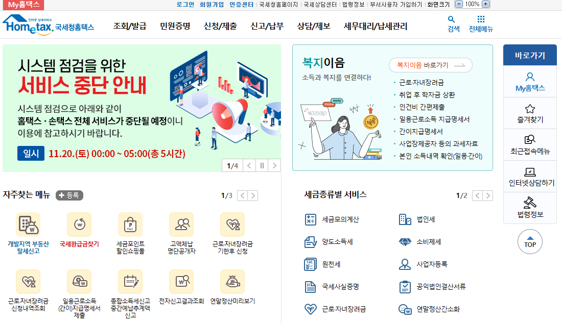 11월 20일 토요일 0시부터 5시까지 총 5시간 시스템 점검을 한다고 하는데 업무를 보실 분들은 미리미리 해놓는 것이 좋을 것 같습니다.