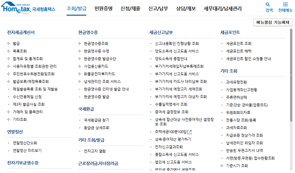 조회/발급메뉴에서는 전자세금계산서, 현금영수중, 세급 신고납부, 기타조회, 발급 등이 보입니다.