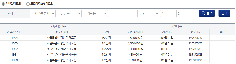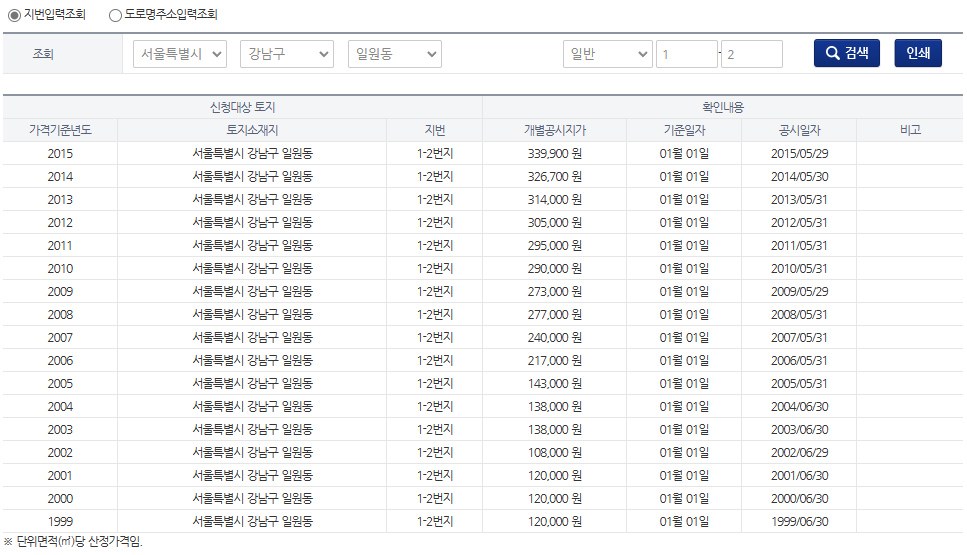 마지막으로 서울특별시 강남구 일원동 공시지가 조회를 해보았습니다.