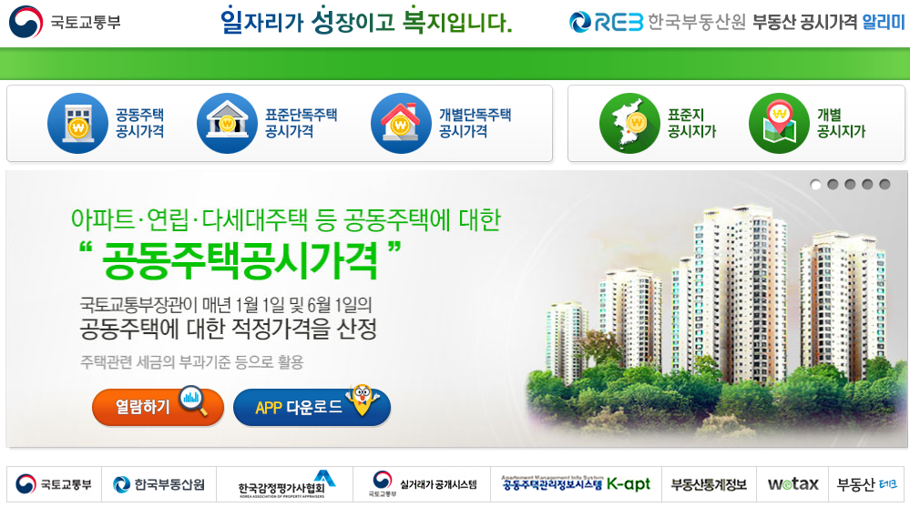 공시지가 조회 사이트에 접속하시면 왼쪽에서부터 공동주택공시가격, 표준단독주택 공시가격, 개별단독주택 공시가격, 표준지 공시지가, 개별 공시지가가 보입니다.