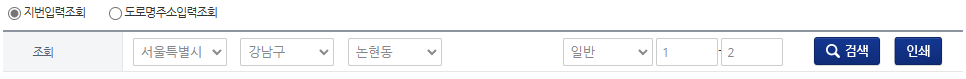 클릭하시면 이렇게 지번 또는 도로명 주소를 입력할 수 있는 페이지로 이동됩니다.