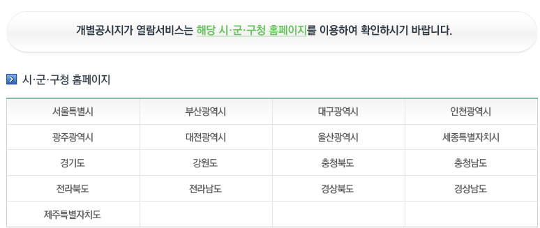 개별 공시지가를 클릭하시면 시, 군, 구청 홈페이지로 갈 수 있는 여러가지 메뉴들이 보일 것입니다.