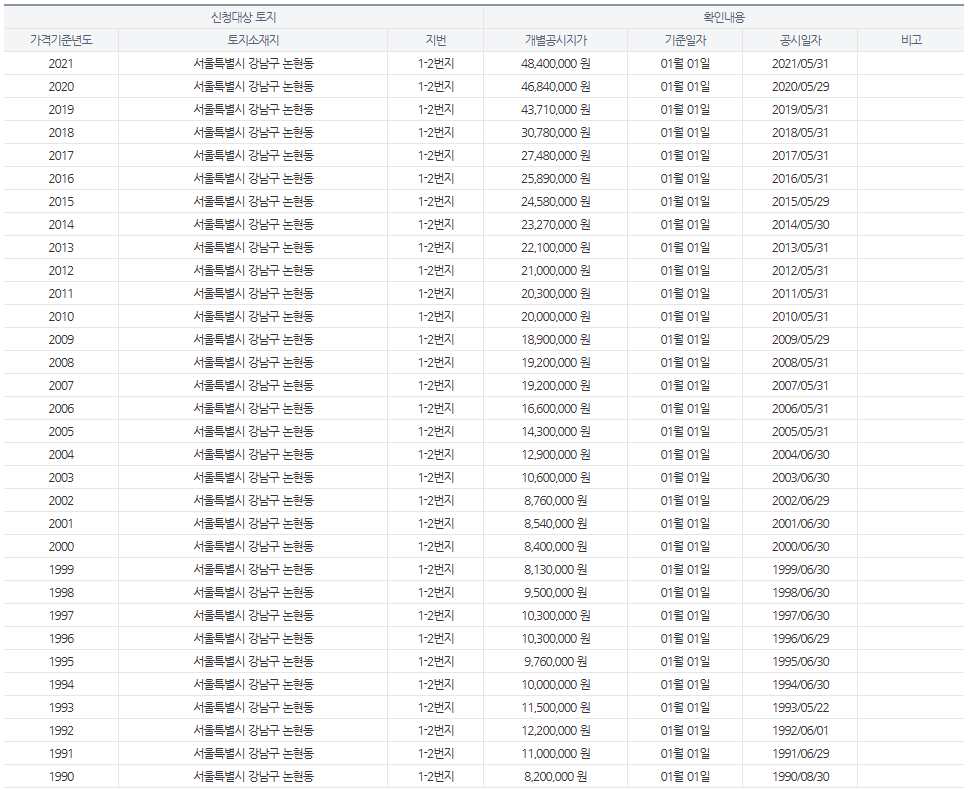1990년부터 2021년도까지 공시지가 조회가 되었는데 2021년 기준 개별 공시지가가 48,400,000원 2020년 46,840,000원, 2019년 43,710,000원, 2018년 30,780,000원, 2017년 27,480,000원, 2016년 25,890,000원이라고 되어 있습니다.