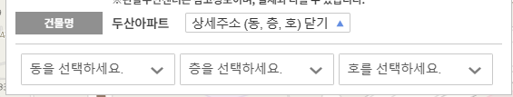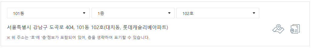 클릭을 하면 다시 동, 층, 호수를 선택할 수가 있고 상세 도로명 주소를 확인할 수 있습니다.