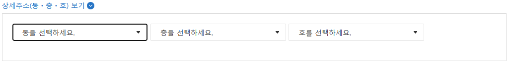 도로명 주소를 확인하셨으면 이제 상세주소도 입력을 하여야 하는데요! 아래쪽에 보이는 상세주소 보기를 클릭하면 동, 층, 호수를 선택할 수 있게 됩니다.