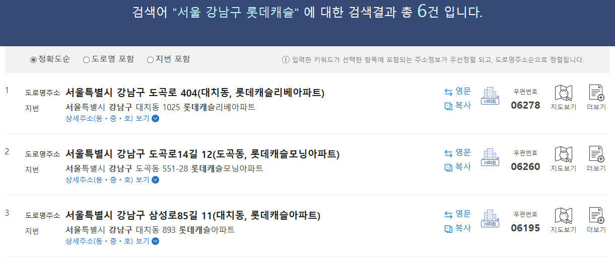 지번 주소 대신 저는 아파트를 입력해서 도로명주소 검색을 해보겠습니다.