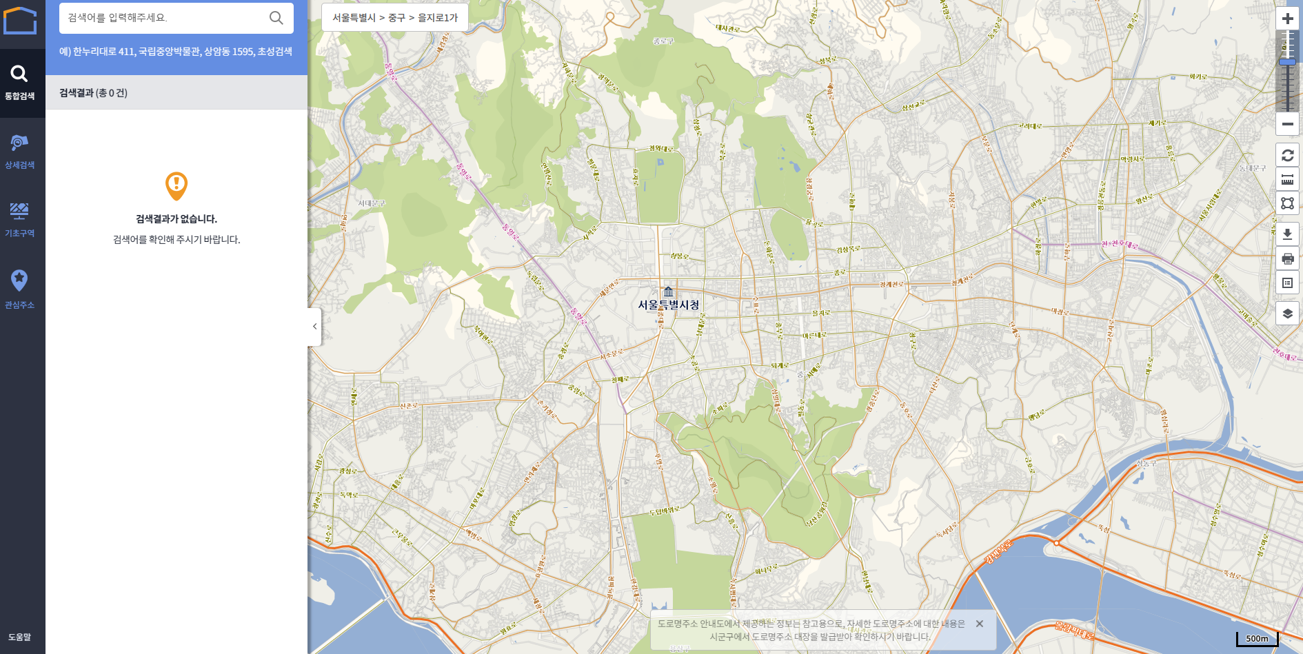 지도를 바로 확대 축소하셔서 도로명주소를 확인하셔도 되고 아니면 왼쪽에 검색창을 이용하셔도 됩니다.