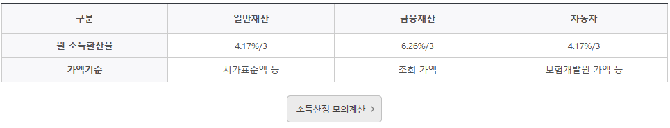 소득 평가액은 소득 - 소득 공제, 재산의 소득 환산액은 (재산-기본재산액(6900만원)-부채) * 월 소득 환산율입니다. 소득환산율은 일반 재산의 경우 월 4.17%/3, 자동차는 월 4.17%/3, 금융재산은 월 6.26%/3 입니다.