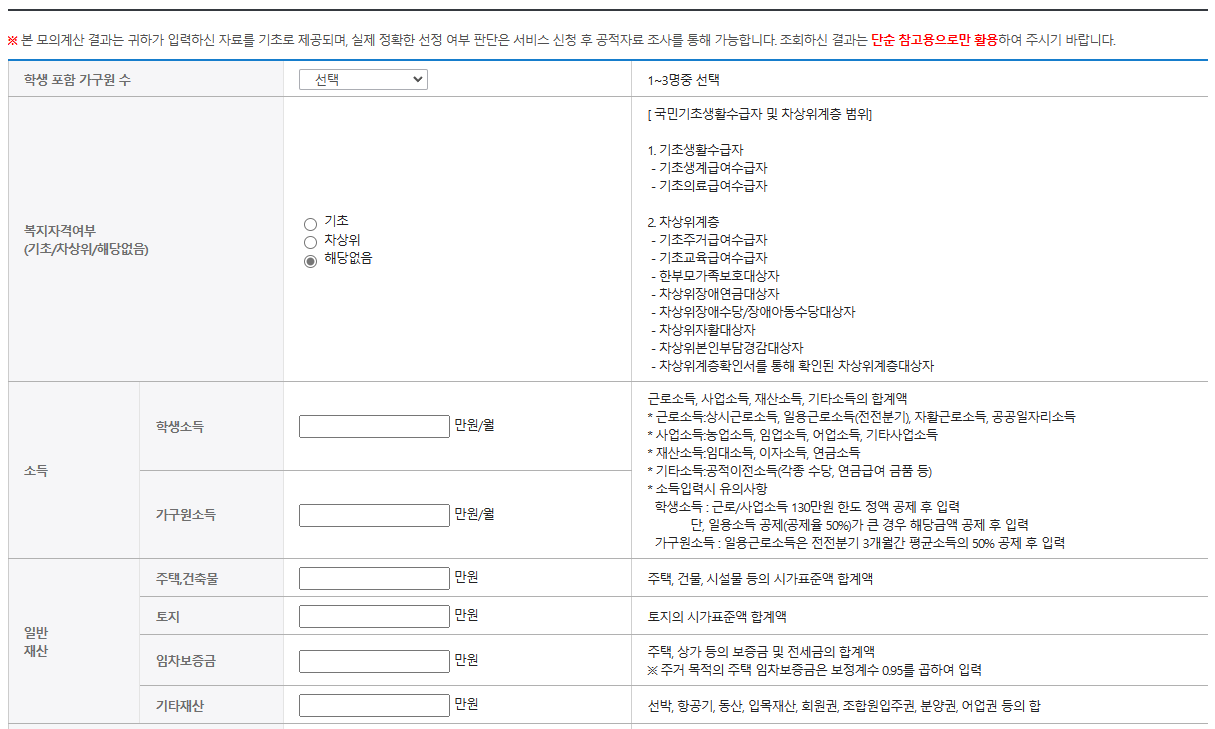 소득인정액 모의 계산기는 가구원수, 소득, 재산 등을 입력하면 간판하게 계산할 수 있도록 되어 있습니다.