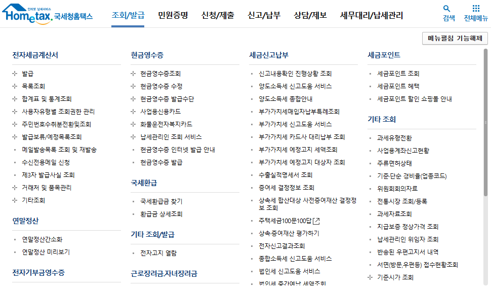 사업자 업종코드 조회는 맨왼쪽 상단에 있는 조회/발급 메뉴에 있습니다.