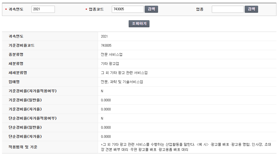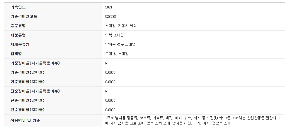 그러자 업종코드에 해당하는 분류명, 세분류명, 세세분류명, 업태명, 기준경비율, 단순 경비율, 적용범위 및 기준을 확인할 수 있습니다.