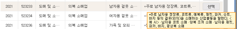 목록 조회창에서 업종을 검색해주셔야 하는데 단어를 입력하시면 됩니다.
