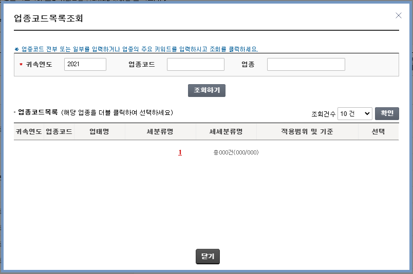 검색 버튼을 클릭하면 사업자 업종코드 목록 조회 창이 열립니다.