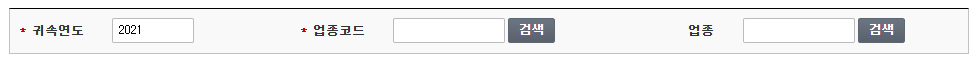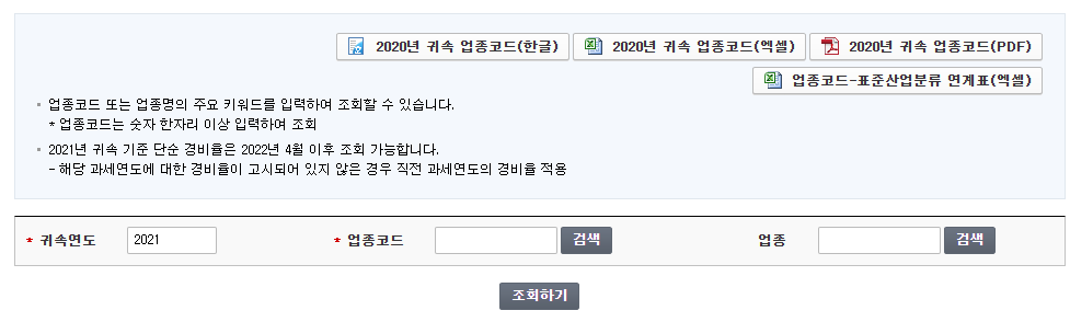 귀속연도, 업종코드, 업종 등을 선택 입력하실 수가 있는데 만약에 업종코드를 알고 있으시면 바로 업종코드를 입력하시고 아래쪽에 있는 조회하기 버튼을 클릭하면 됩니다.