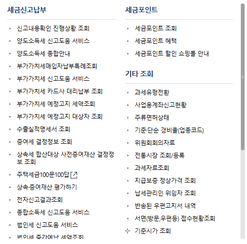 조회/발급에 마우스커서를 올려놓으시면 홈페이지에서 할 수 있는 모든 조회 서비스들이 보입니다.
