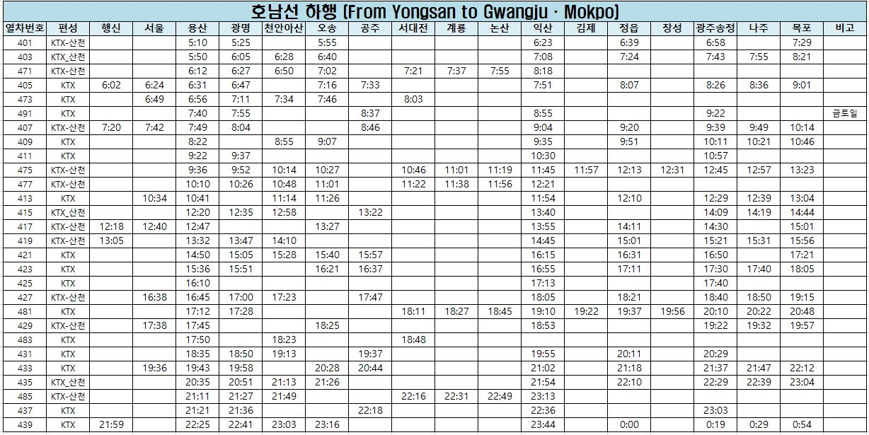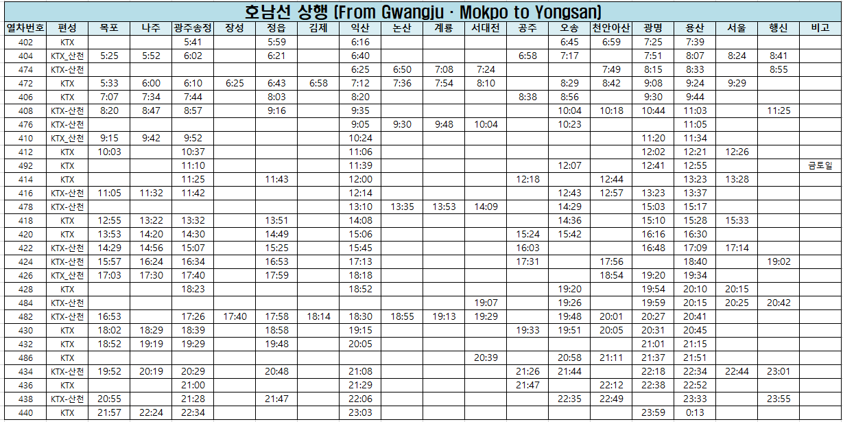 마지막으로 호남선 상행 ktx열차 시간표입니다.