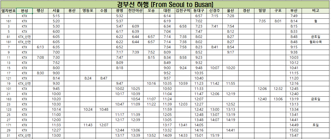 ktx열차 시간표를 다운로드 받아놓으시면 유용하게 사용하실 수 있을 것입니다.