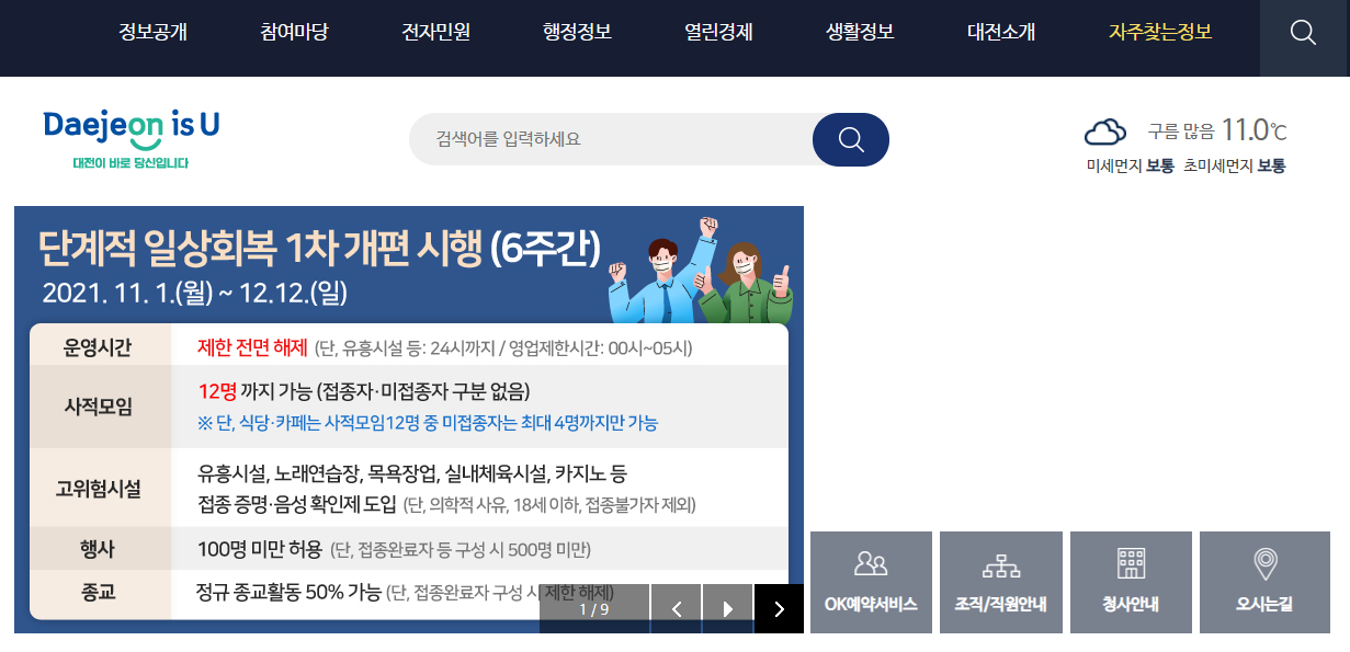 그리고 현재 대전은 단계적 일상회복 1차 개편을 6주간 시행한다고 되어 있습니다. 운영시간 제한이 전면 해제되었다고 하며 사적보임은 12명 까지 가능하다고 되어 있습니다. 그리고 고위험시설은 접종 증명 음성 확인제를 도입했다고 되어 있고 행사는 100명 미만만 허용된다고 합니다.