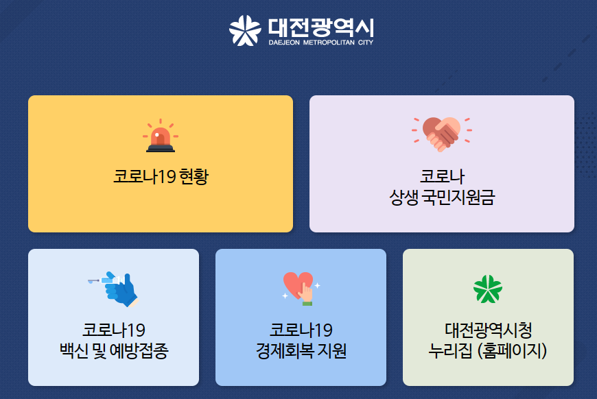 대전시청 홈페이지에 처음 접속하면 코로나 19 현황, 코로나 상생 국민지원금, 백신 및 예방접종, 대전광역시청 홈페이지가 보입니다.