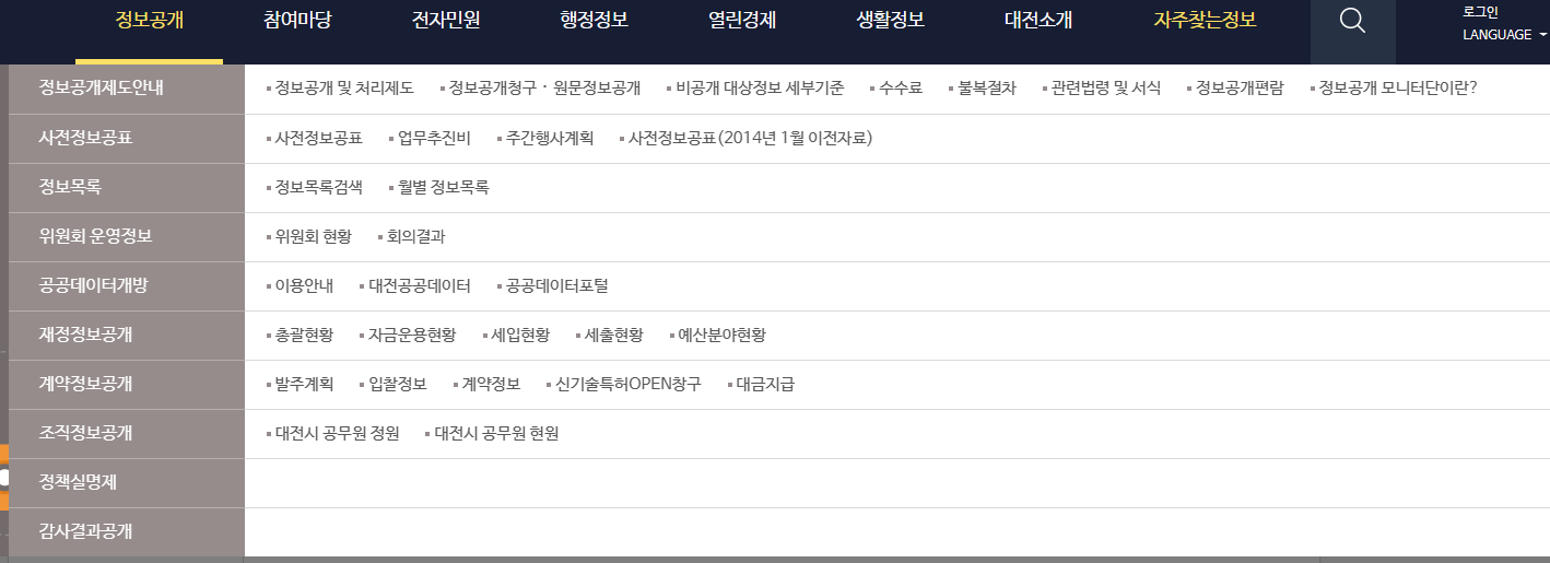 위쪽에서부터 정보공개, 참여마당, 전자민원, 행정정보, 생활정보, 대전 소개 등이 있습니다.