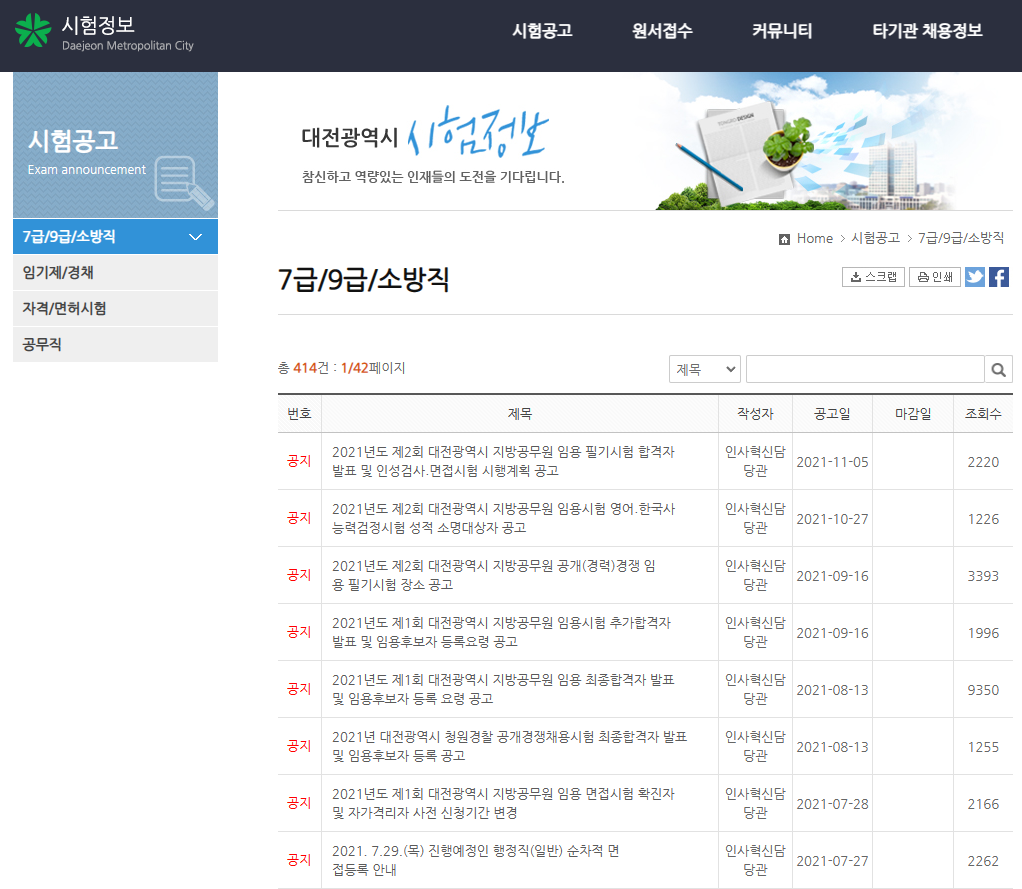 아까 공무원 시험 준비를 하시는 분들도 대전시청 홈페이지에 접속하시면 정보를 확인하실 수가 설명드렸는데 시험정보를 클릭해보겠습니다.