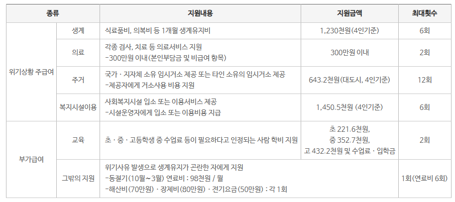 아무 복지정책이나 클릭하면 이렇게 종류별, 지원내용, 지원금액, 횟수를 확인하실 수가 있습니다.