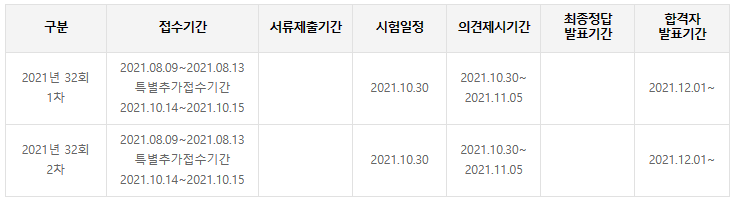 2021년 32회 1차, 2차 접수기간은 2021년 8월 9일부터 2021년 8월 13일까지이며, 특별추가접수기간은 2021년 10월 14일부터 15일까지입니다. 공인중개사 시험일정은 2021년 10월 30일, 의견제시기간은 2021년 10월 30일부터 11월 5일까지, 합격자 발표기간은 2021년 12월 1일부터라고 되어 있습니다. 2주 후면 공인중개사 합격자 발표기간인데 화이팅 하셨으면 좋겠습니다.