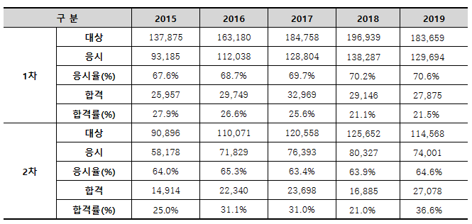 2019년 기준 1차 합격률은 21.5%, 2차 합격률은 36.6%, 2018년 기준 1차 합격률은 21.1%, 2차 합격률은 21%, 2017년 기준 1차 합격률은 25.6%, 2차 합격률은 31%입니다.
