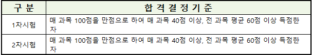 합격기준은 1차시험 2차시험 매 과목 100점을 만점으로 하여 매 과목 50점 이상, 전 과목 평균 60점 이상 득점한 자 입니다.