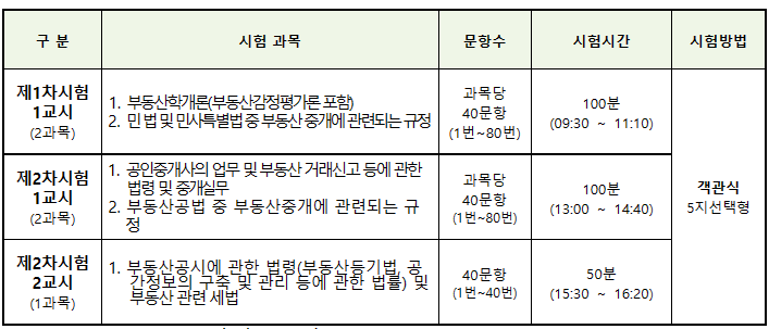 제 1차시험은 부동산 학개론(부동산감정평가론 포함) 민법 및 민사특별법 중 부동산 중개에 관련되는 규정 2과목으로 과목당 40문항으로 시험시간은 9시 30분부터 11시 10분까지 시험시간은 100분입니다.