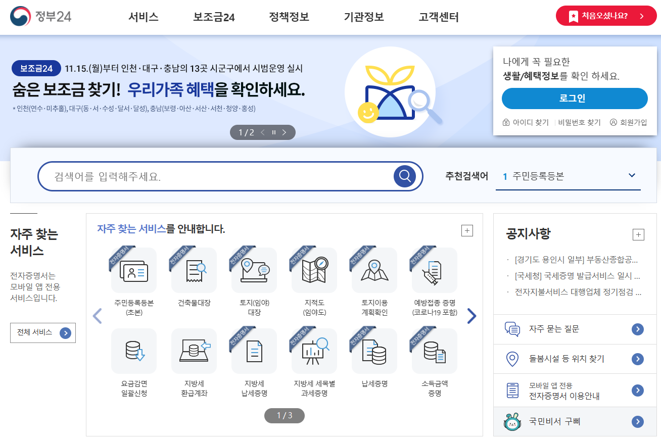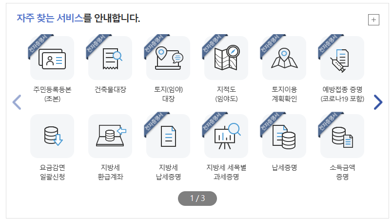 홈페이지에 접속하면 여러가지가 보이실텐데 아래족을 보면 자주찾는 서비스가 있습니다. 자주찾는 서비스를 보면 예방접종 증명서 인터넷발급 메뉴가 있는데 찾으셨나요?