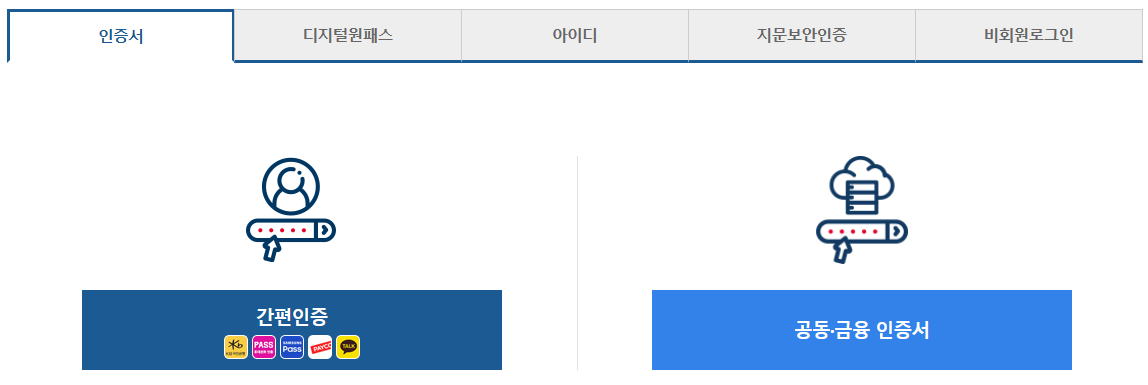 만약에 카카오톡 간편인증에 가입이 되어 있지 않으시면 공동인증서를 이용하여 인증을 하면 됩니다.