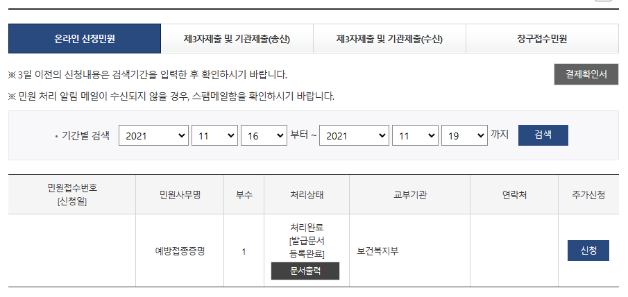 신청을 제대로 하셨으면 온라인 신청 민원 내역으로 페이지가 이동 될 것입니다.