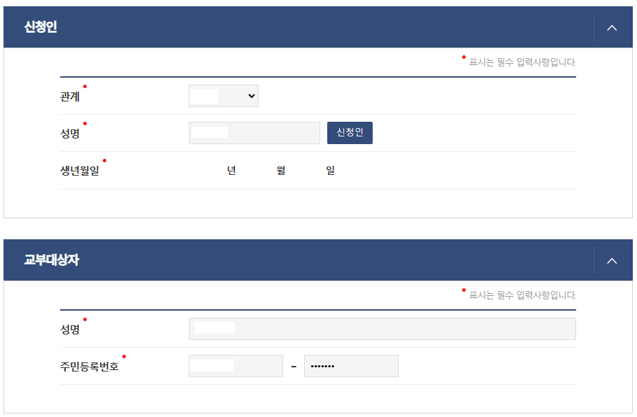 아래로 조금 내리시면 신청인, 교부대상자의 인적사항이 나옵니다. 아마 회원가입이 되어 있으신 분들은 자동으로 입력되어 있으니 따로 입력을 하실 필요는 없습니다.