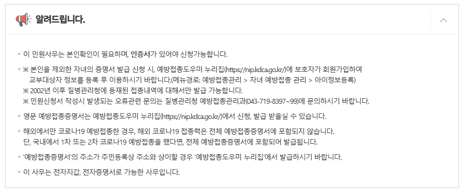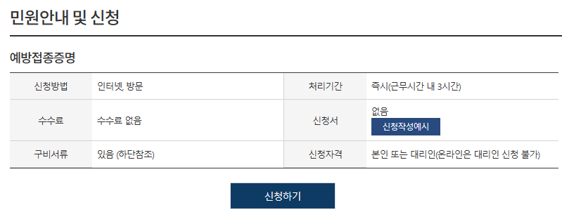 우선 예방접종 증명서 인터넷발급 수수료는 없으니 참고하시면 좋을 것 같고 읽어보셨으면 아래쪽에 신청하기 버튼을 클릭하시기 바랍니다.