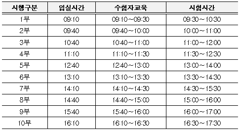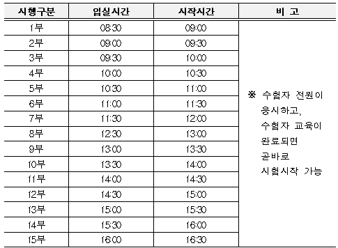 실기시험은 1부~15부 시행이되며 1부는 입실시간이 8시 30분 시작시간은 9시까지, 2부는 입실시간이 9시, 시작시간은 9시 30분입니다. 참고사항으로 실기 시험도 소속기관별·시험장별로 별도 지정하니 참고하시기 바랍니다.